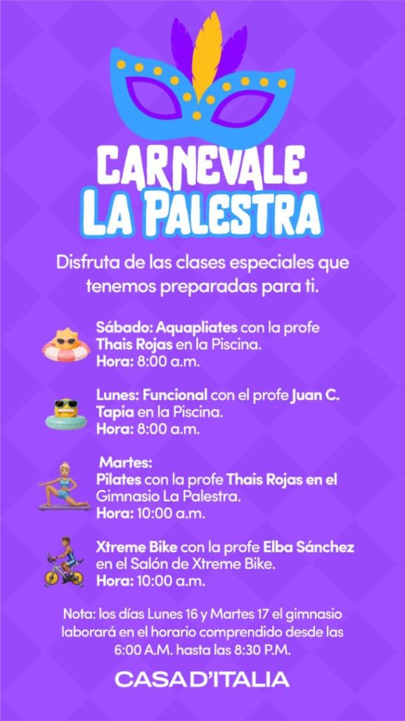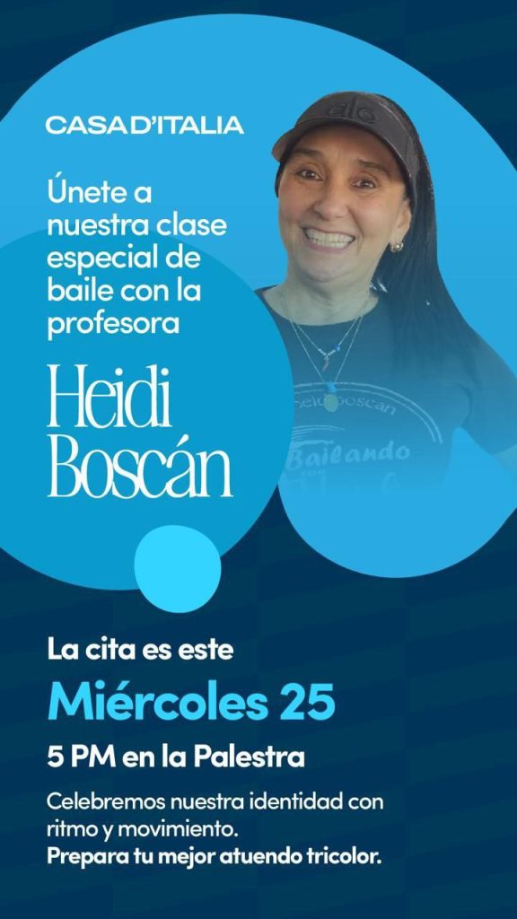 Estimado socio. Le invitamos a nuestra Clase Especial de Baile con la profesora Heidi Boscán. Vamos a ejercitarnos y disfrutar de un día con mucho ritmo y movimiento 💃. 🗓 Fecha: Este miércoles 25🕔 Hora: 5:00 PM👕 Vestimenta: Tricolor.📍 Lugar: La Palestra. ¡No faltes, te esperamos para disfrutar juntos A Casa Nostra!
