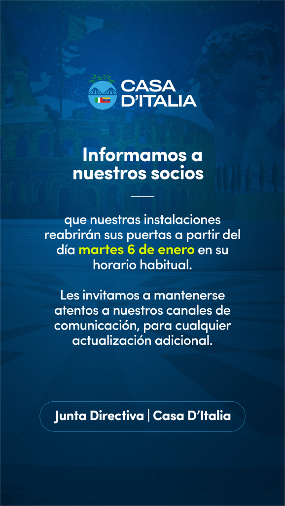 Estimado socio. Informamos que nuestras instalaciones reabrirán sus puertas a partir del día martes 6 de enero en su horario habitual. Les invitamos a mantenerse atentos a nuestros canales de comunicación para cualquier actualización adicional. Junta Directiva.
