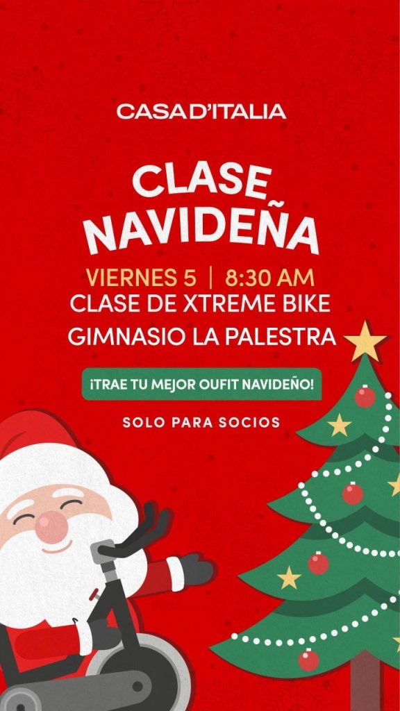 EEstimado socio, 🎄🚴 ¡Clase Especial de Xtreme Bike Navideña! 🚴🎄 Los invitamos a nuestra Clase Especial de Xtreme Bike para recibir la Navidad con toda la energía. 🎅✨ 📅 Fecha: Viernes 5 de diciembre. ⏰ Hora: 8:30 a.m.📍 Lugar: Salón de Xtreme Bike. 👗 Dress Code: Navidad (¡Trae tu gorro, colores rojos/verdes o tu outfit …