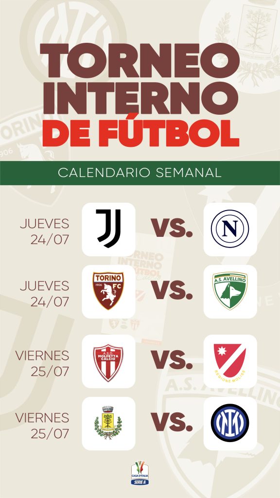 Este jueves 24 y viernes 25 de julio de 2025, te invitamos a disfrutar en el mejor ambiente deportivo y familiar del Torneo Interno de Fútbol a Casa Nostra, de los juegos entre: