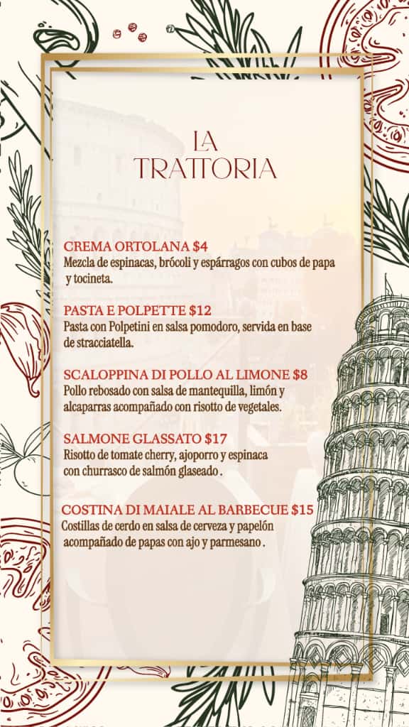 ¡Menu Fine Settimana! / Gastronomía / Por Dpto. de Comunicaciones Estimado socio. Te esperamos en nuestra Trattoria Ristorante, para que disfrutes las «Sugerencias del fin de semana» CREMA ORTOLANA PASTA E POLPETTE SCALOPPINA DI POLLO AL LIMONE SALMONE GLASSATO COSTINA DI MAIALE AL BARBECUE