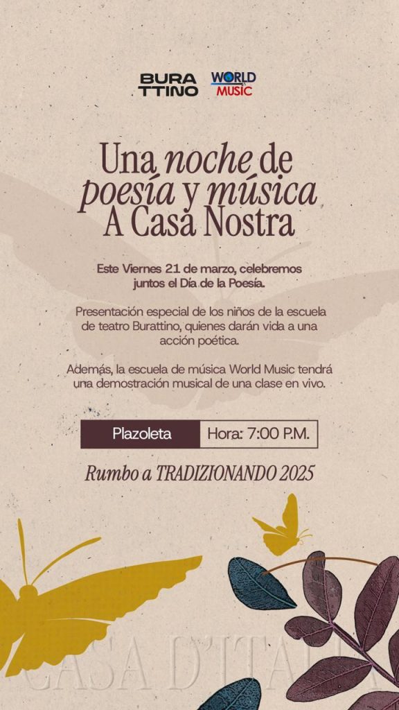 Acción poética, a cargo de los niños de la escuela de Teatro Burattino, junto a una demostración musical de una clase en vivo por parte de nuestra Escuela de Música World Music.