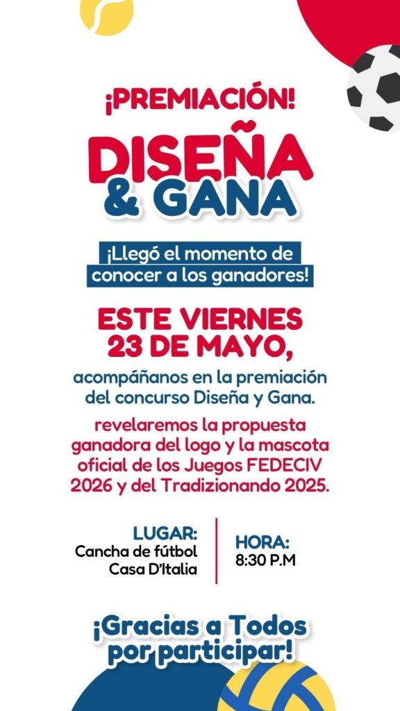 Durante la premiación revelaremos la propuesta ganadora del logo y la mascota oficial de los Juegos FEDECIV 2026 & del Tradizionando 2025.