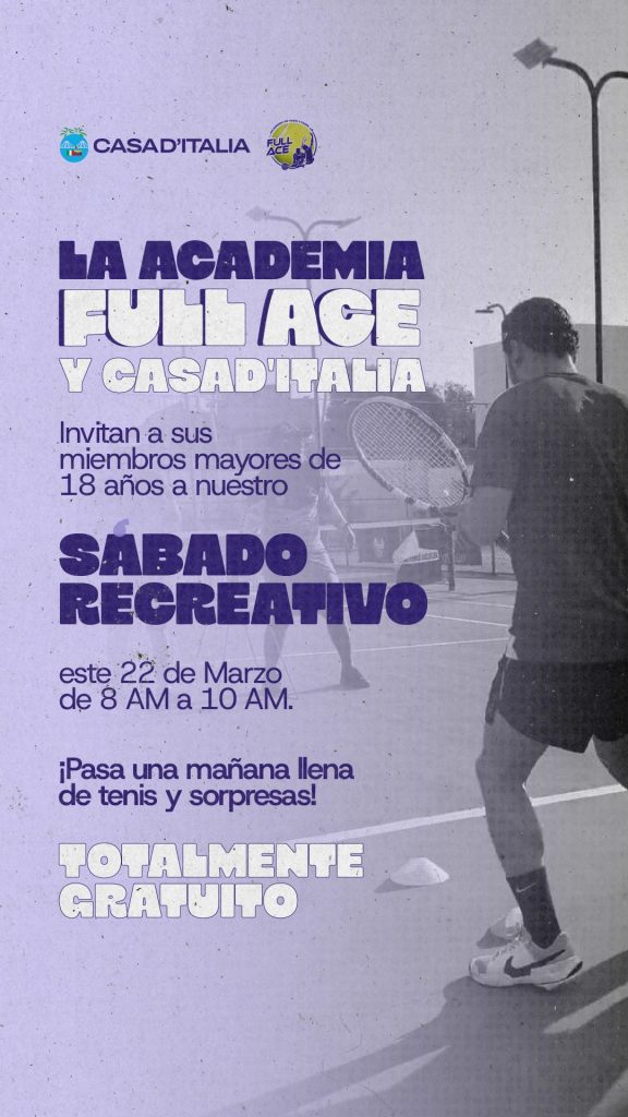 Este Sábado 22 de marzo, Casa D’Italia & la Academia Full Ace, invitan a los socios mayores de 18 años a participar en el Sábado Recreativo.